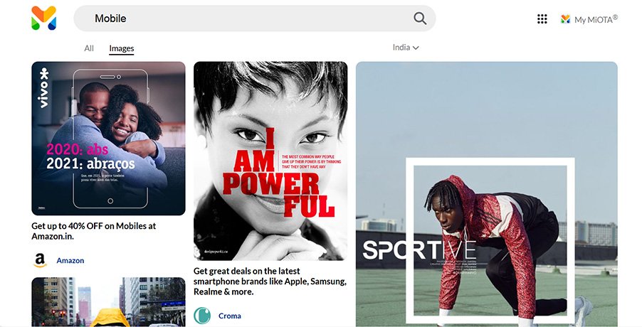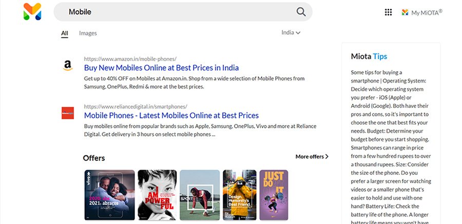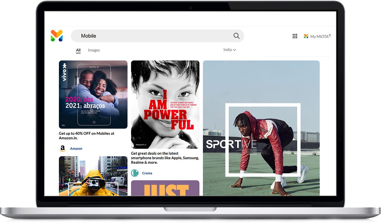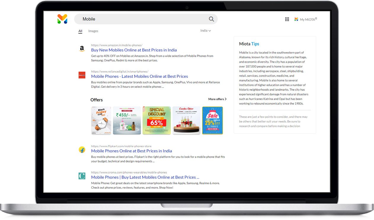 MiOTA® is the shopping search engine, users can do a direct search using search bar OR they can simply browse by category. E-commerce sites can display offers directly to customers and drive sales